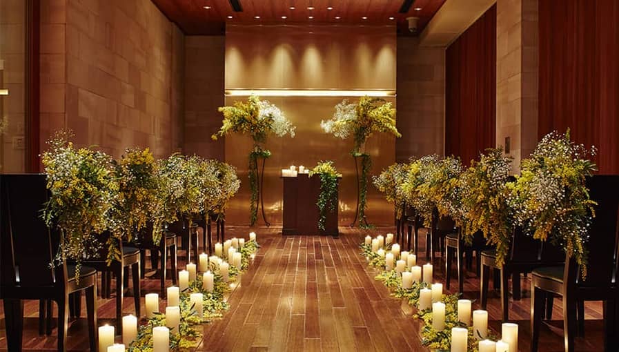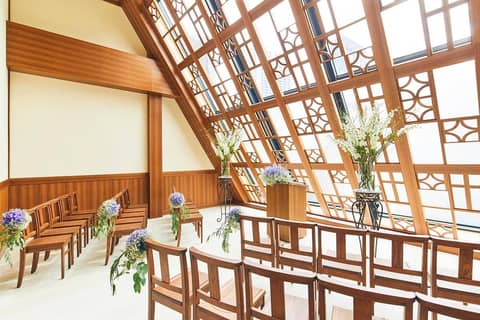 レストラン内「カムンチャペル」、隣に併設された「チャペルKagura」、二つの挙式会場からお選びいただけます。少人数挙式にちょうど良いスペース。大人数なら披露宴内人前式がおすすめです。